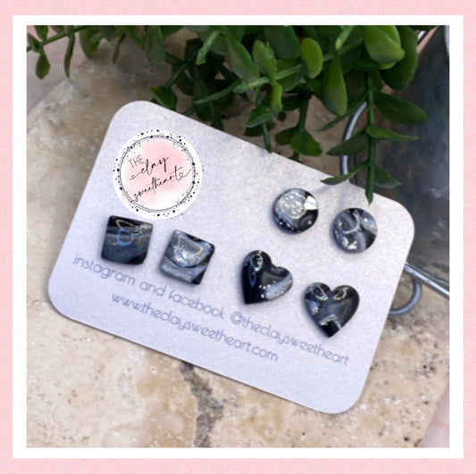 1319 black and silver polymer clay stud earrings
