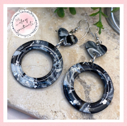 1405 black and copper polymer clay hoop heart earrings