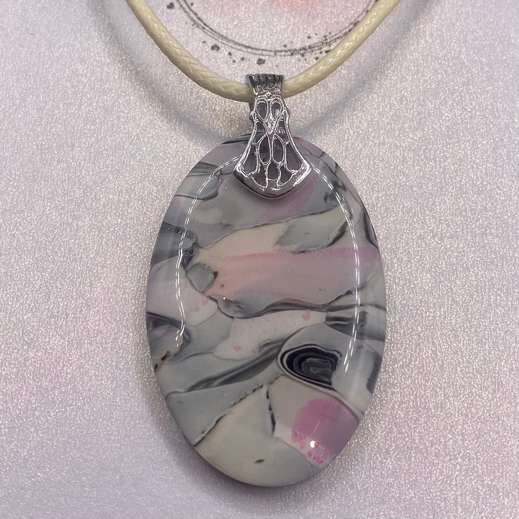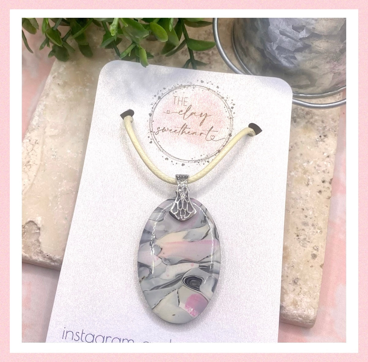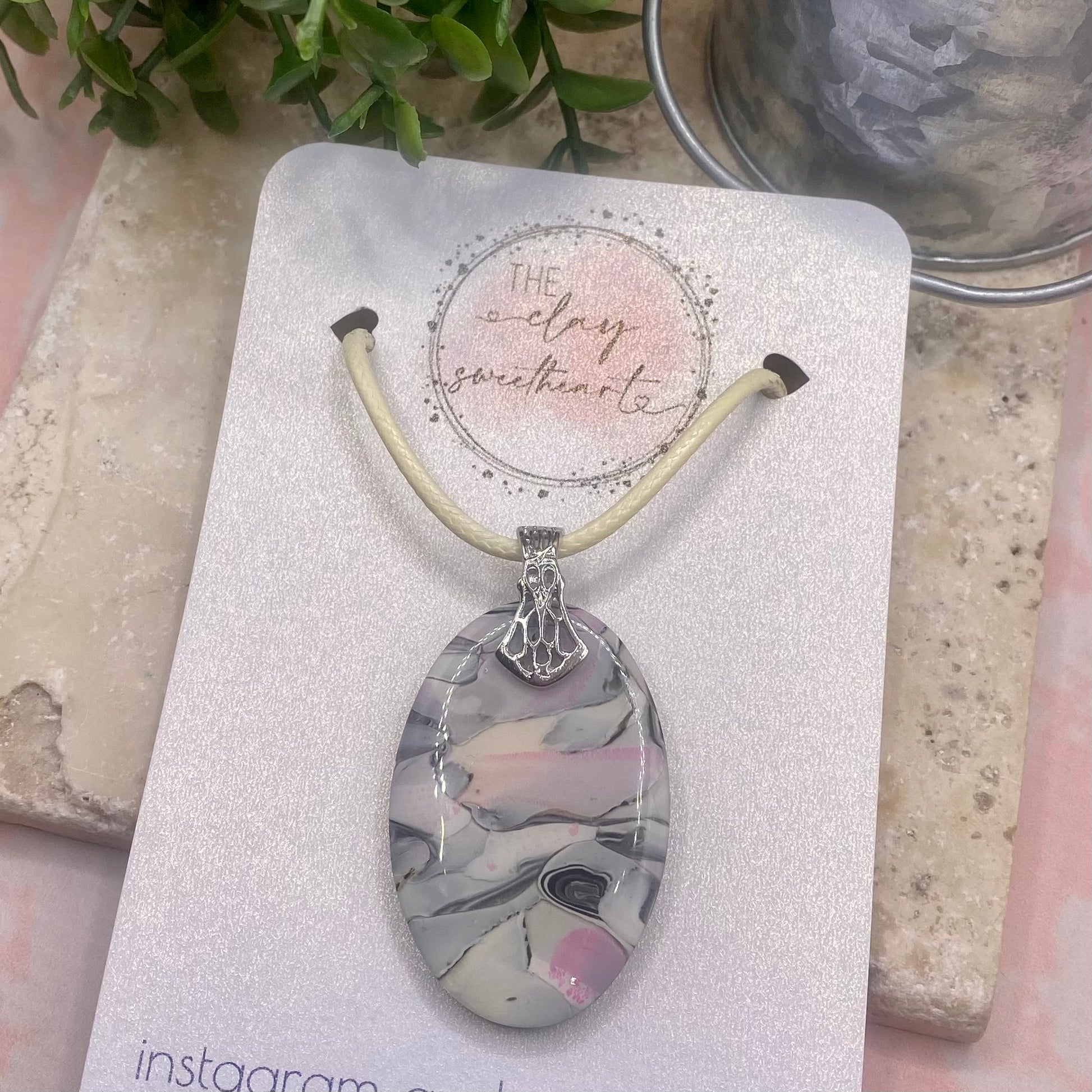Polymer clay necklace on a 16” cream colored cord with 2” extender.