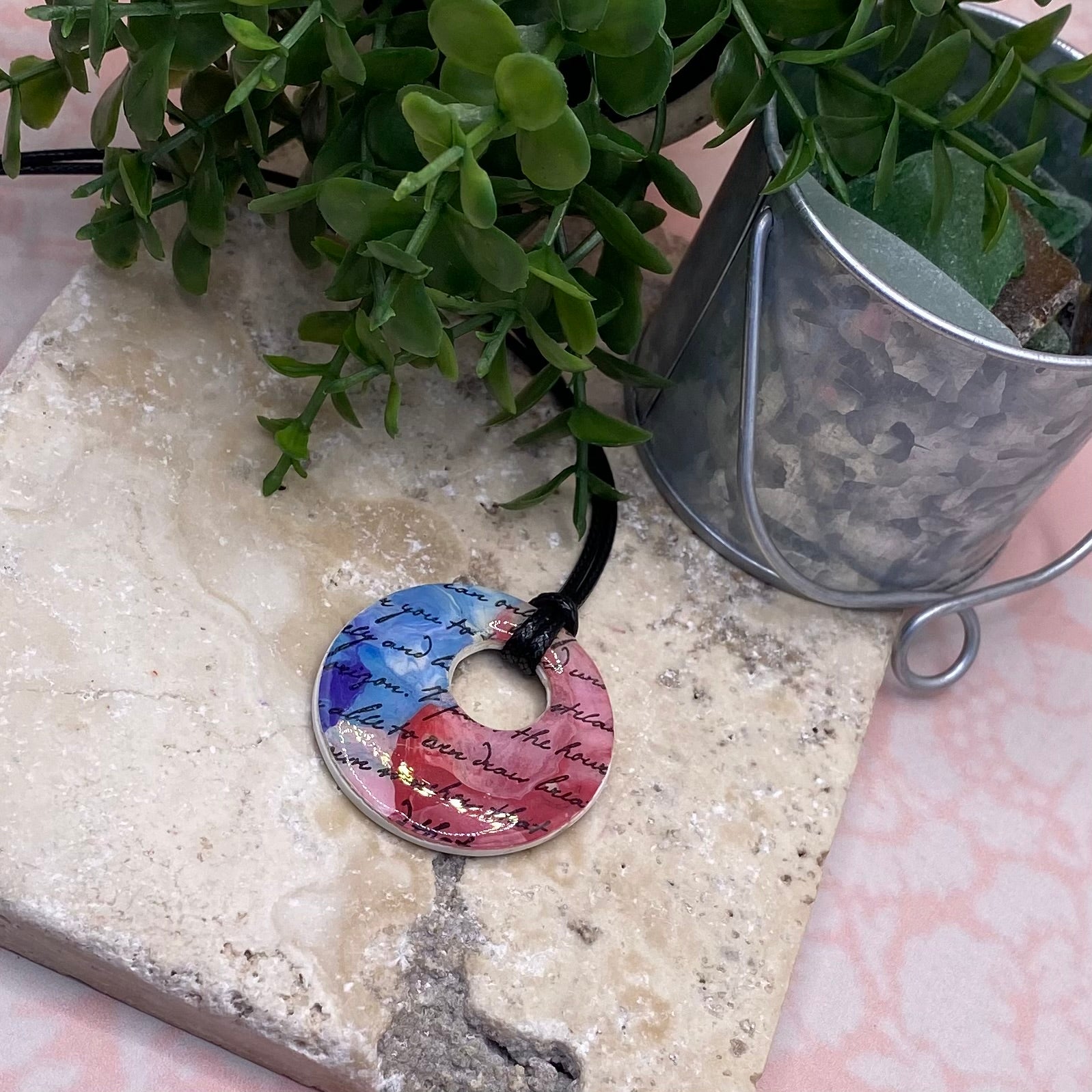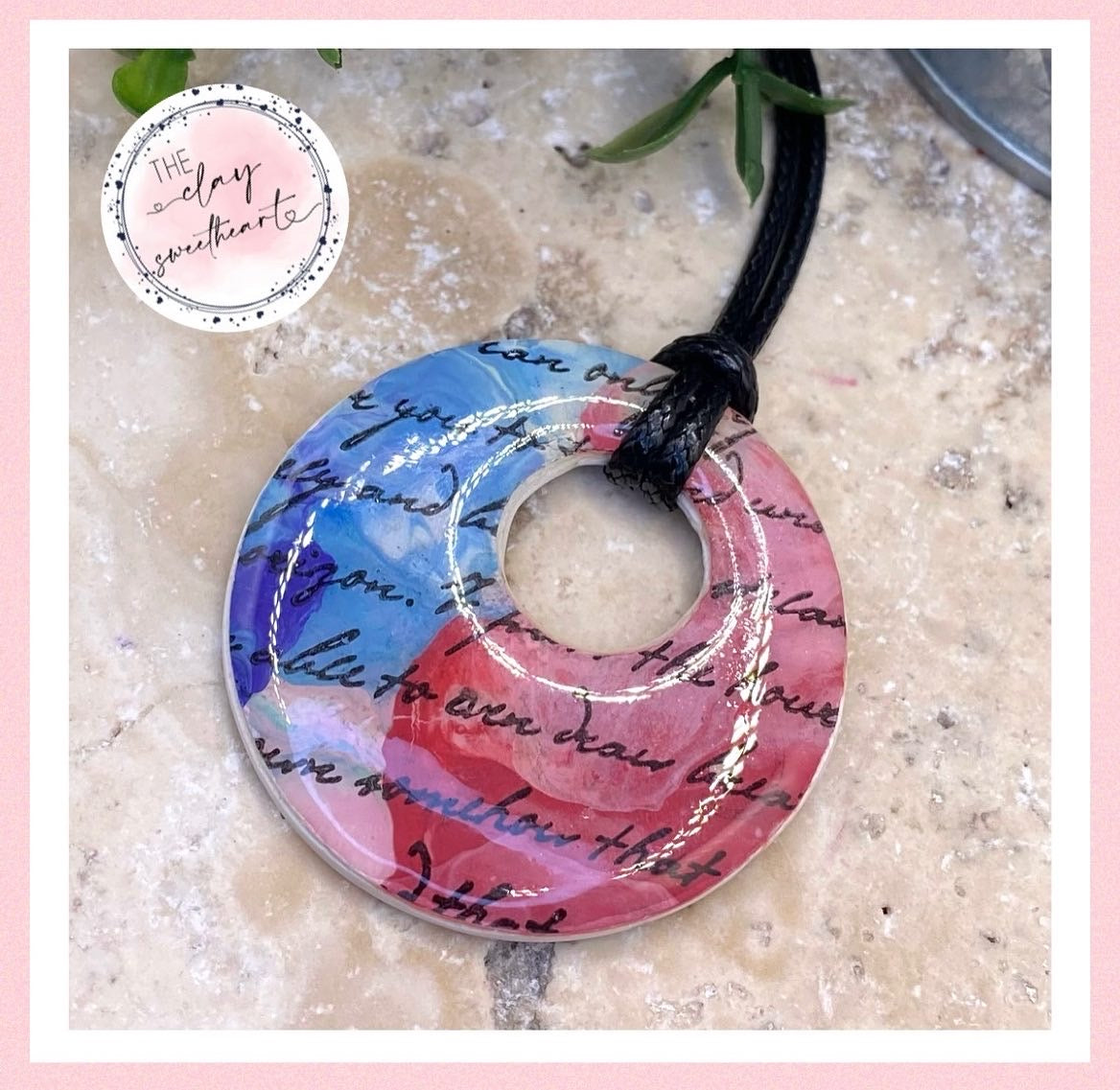 Polymer clay circle (1.5” diameter) necklace on a 16” black cord with 2” extender.