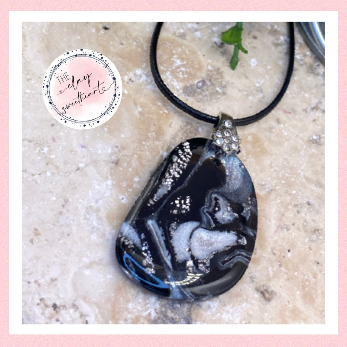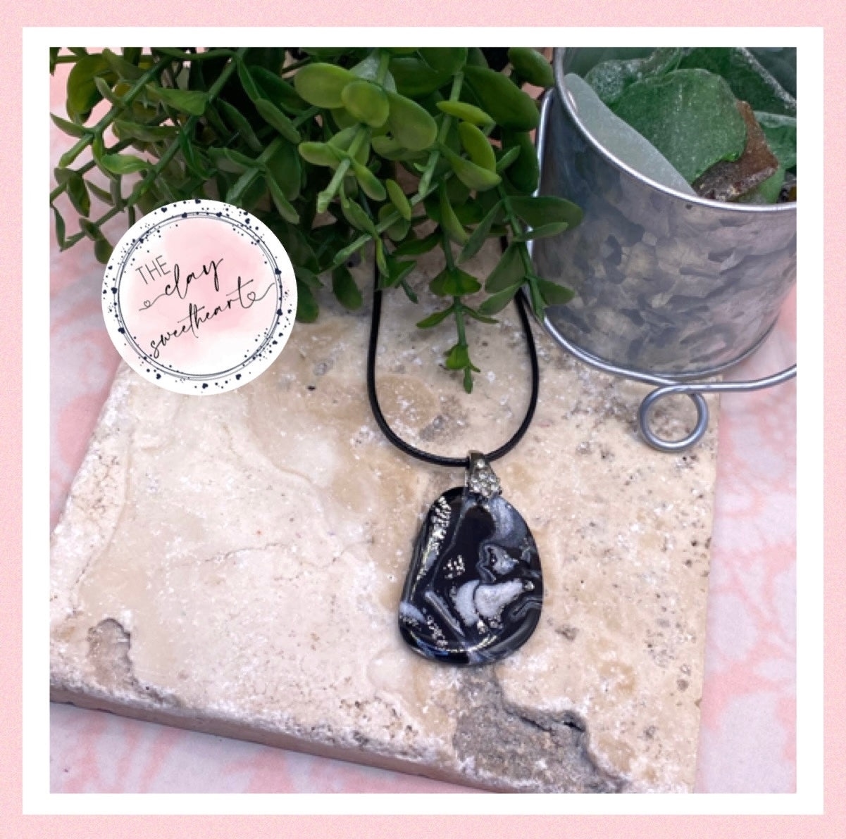 Black and silver polymer clay necklace on a 16” black cord with 2” extender.