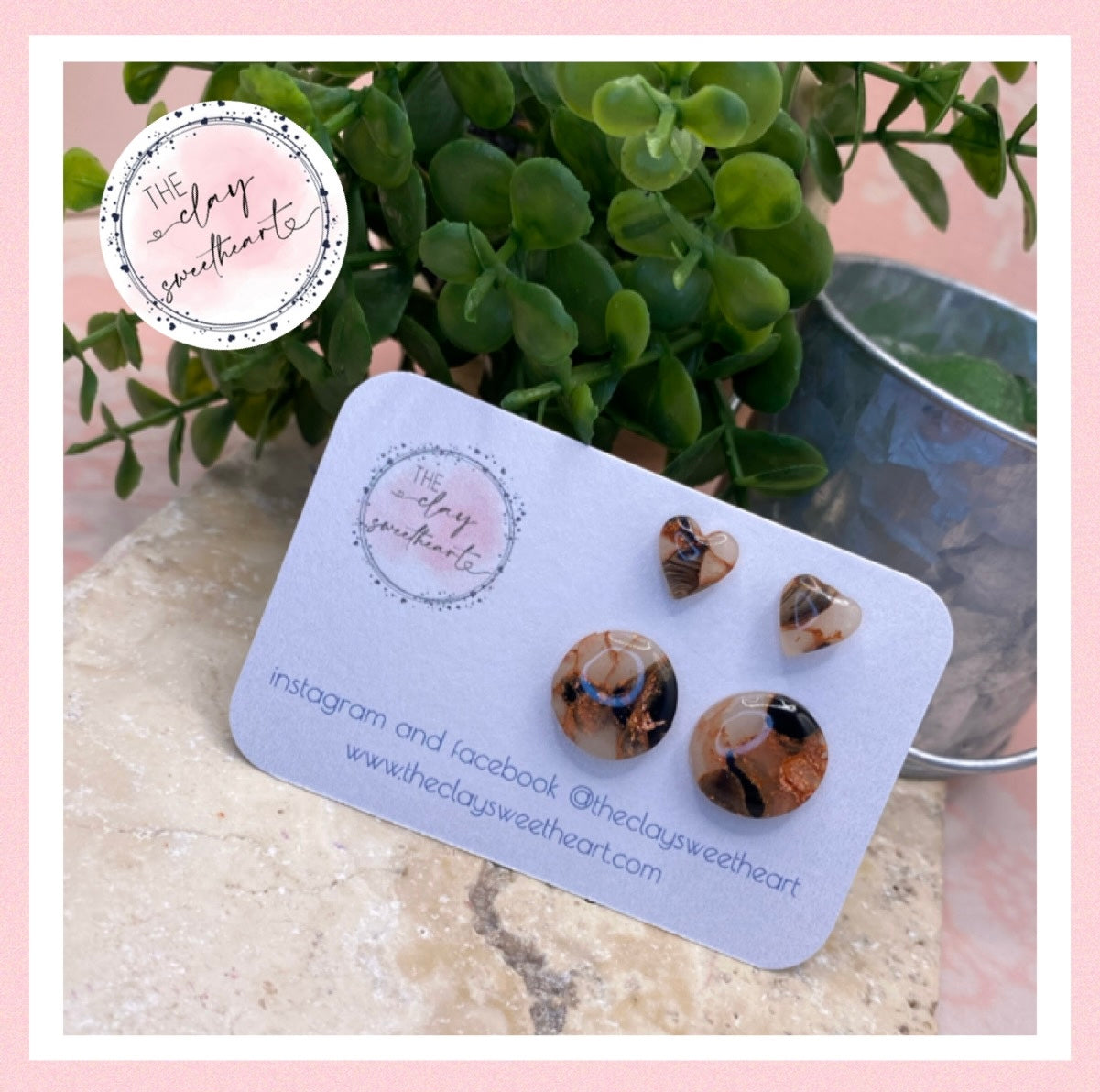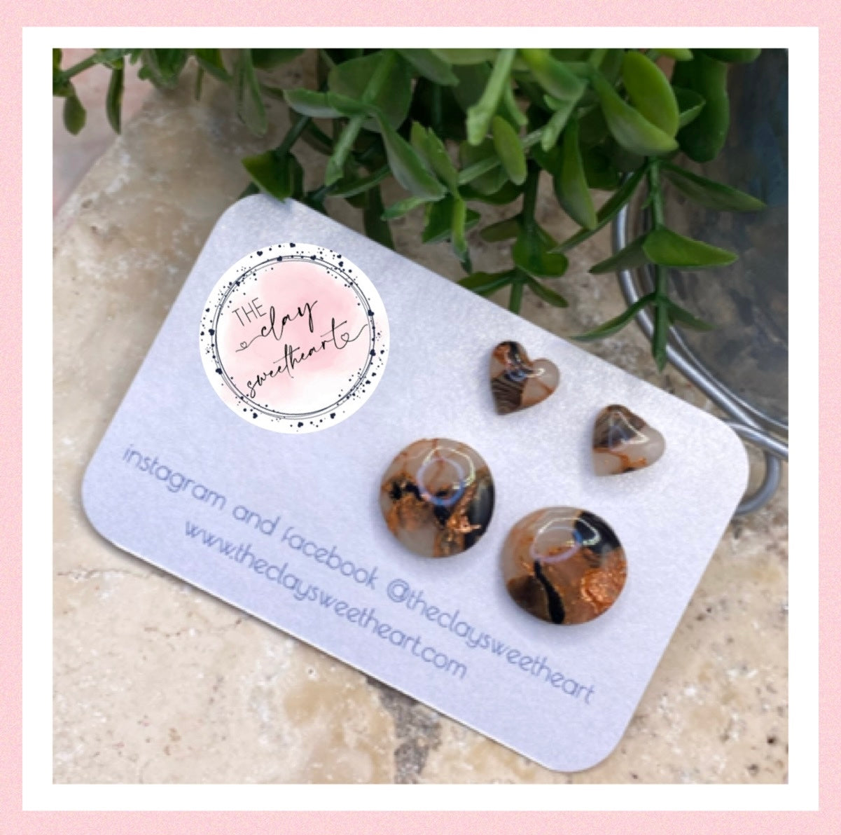 Black and copper polymer clay stud earrings with stainless steel posts.