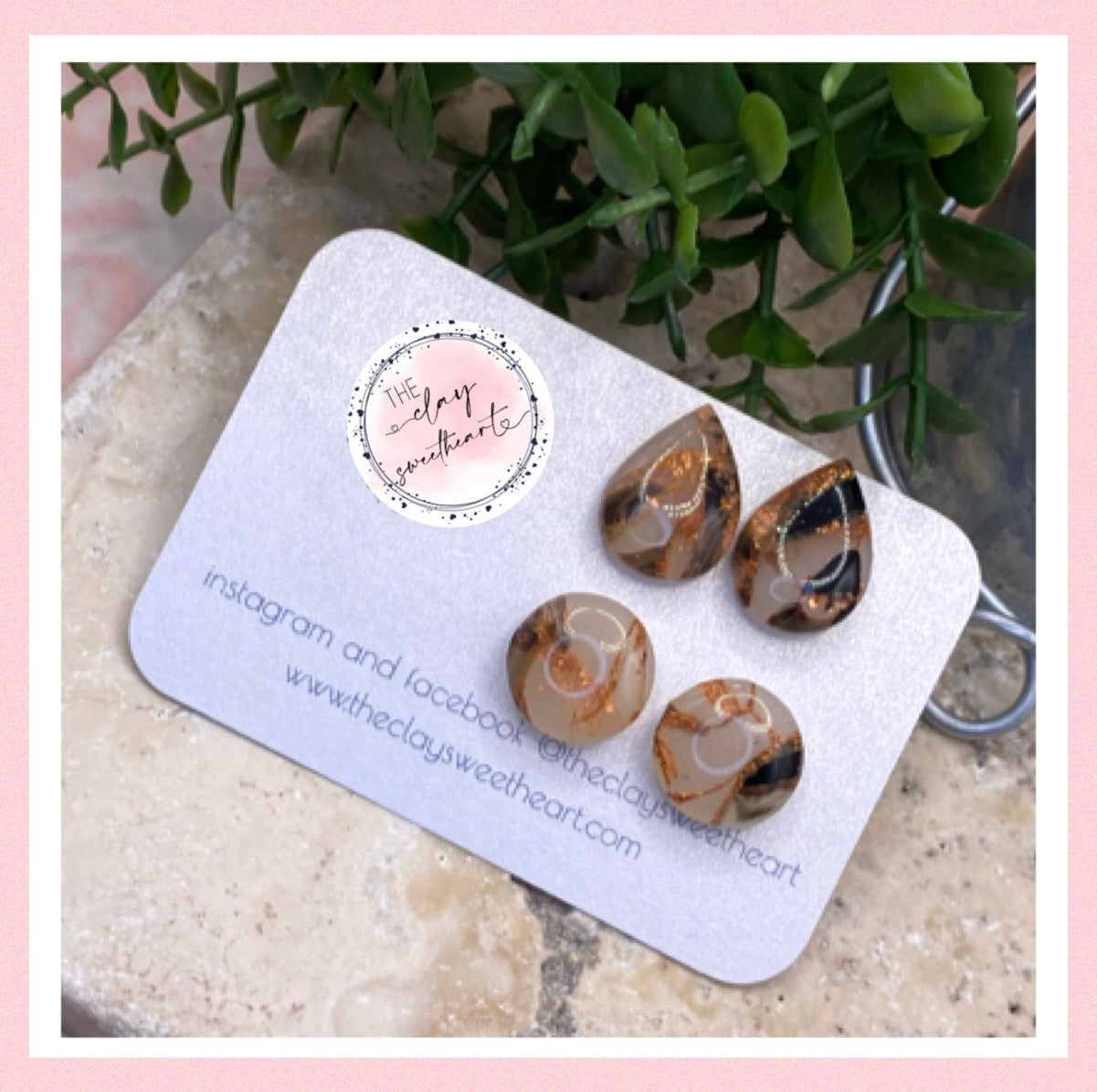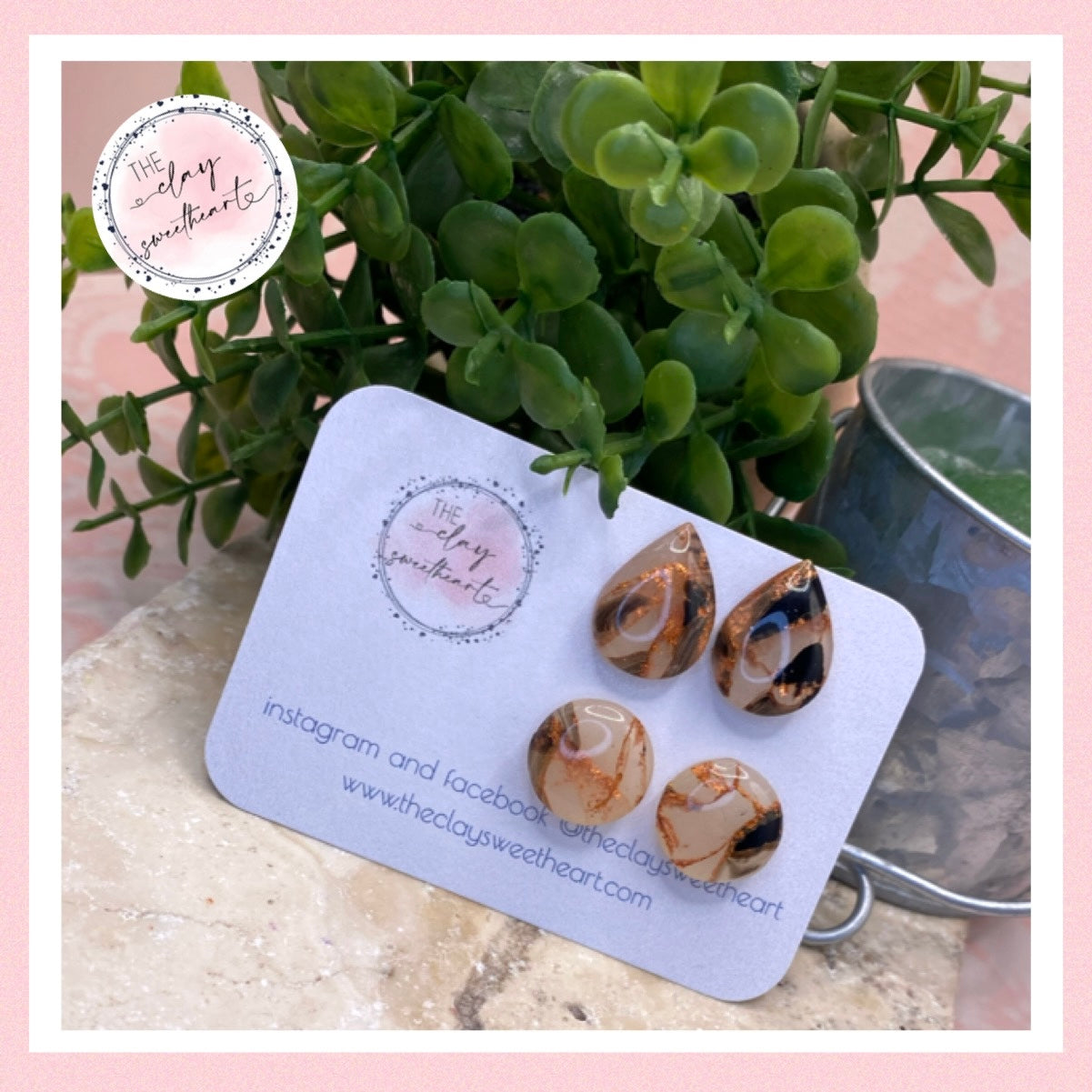 Black and copper polymer clay stud earrings with stainless steel posts.