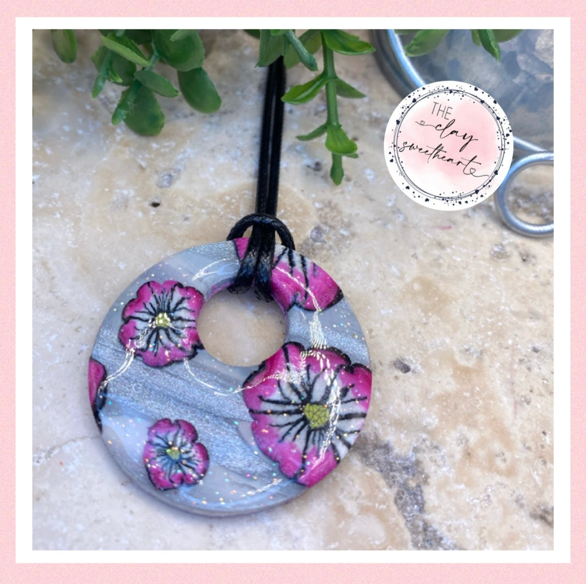 Silver with pink flowers polymer clay circle necklace with 16” black cord with a 2” extender.