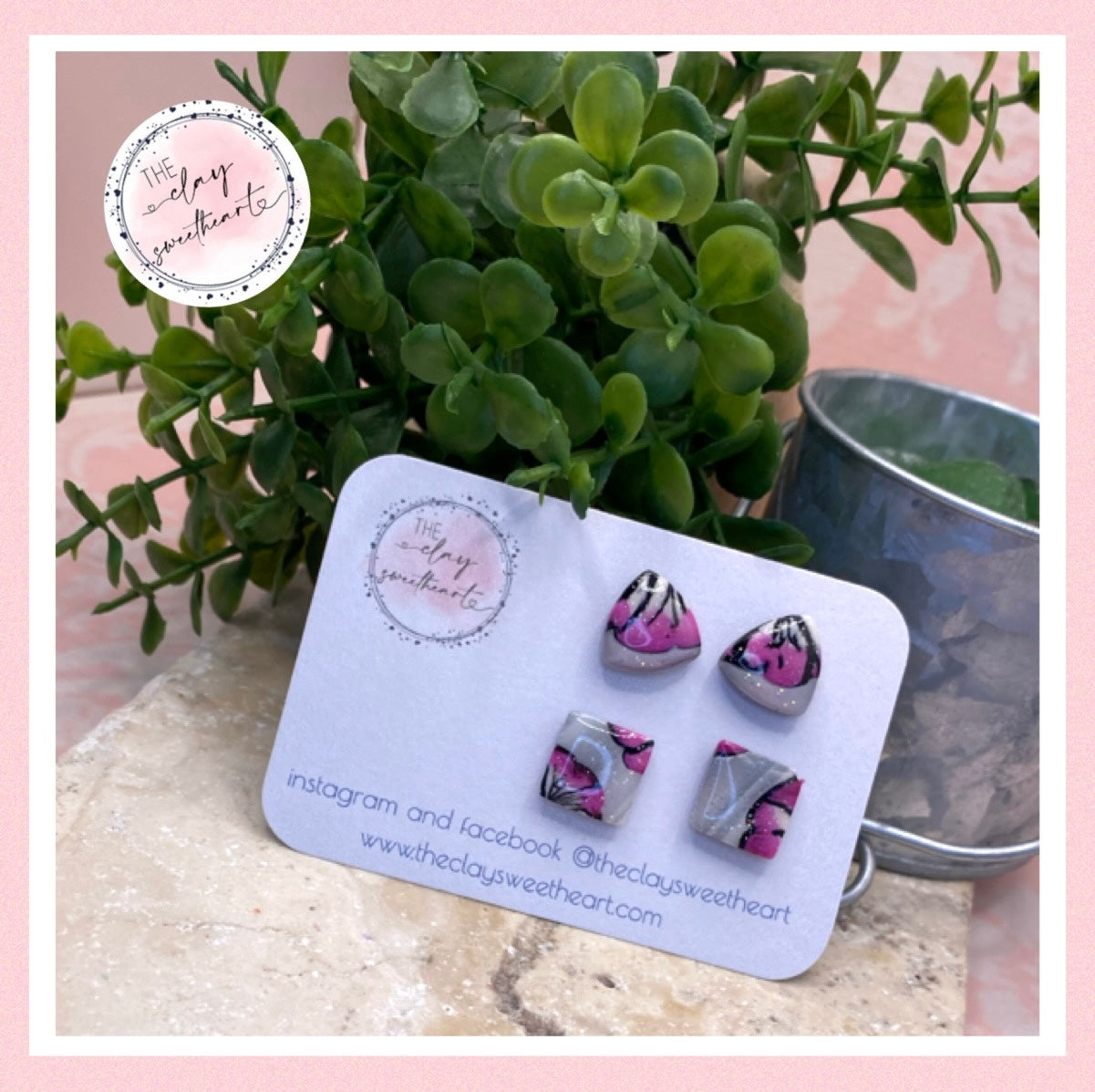Silver with pink flowers polymer clay stud earrings with stainless steel posts.