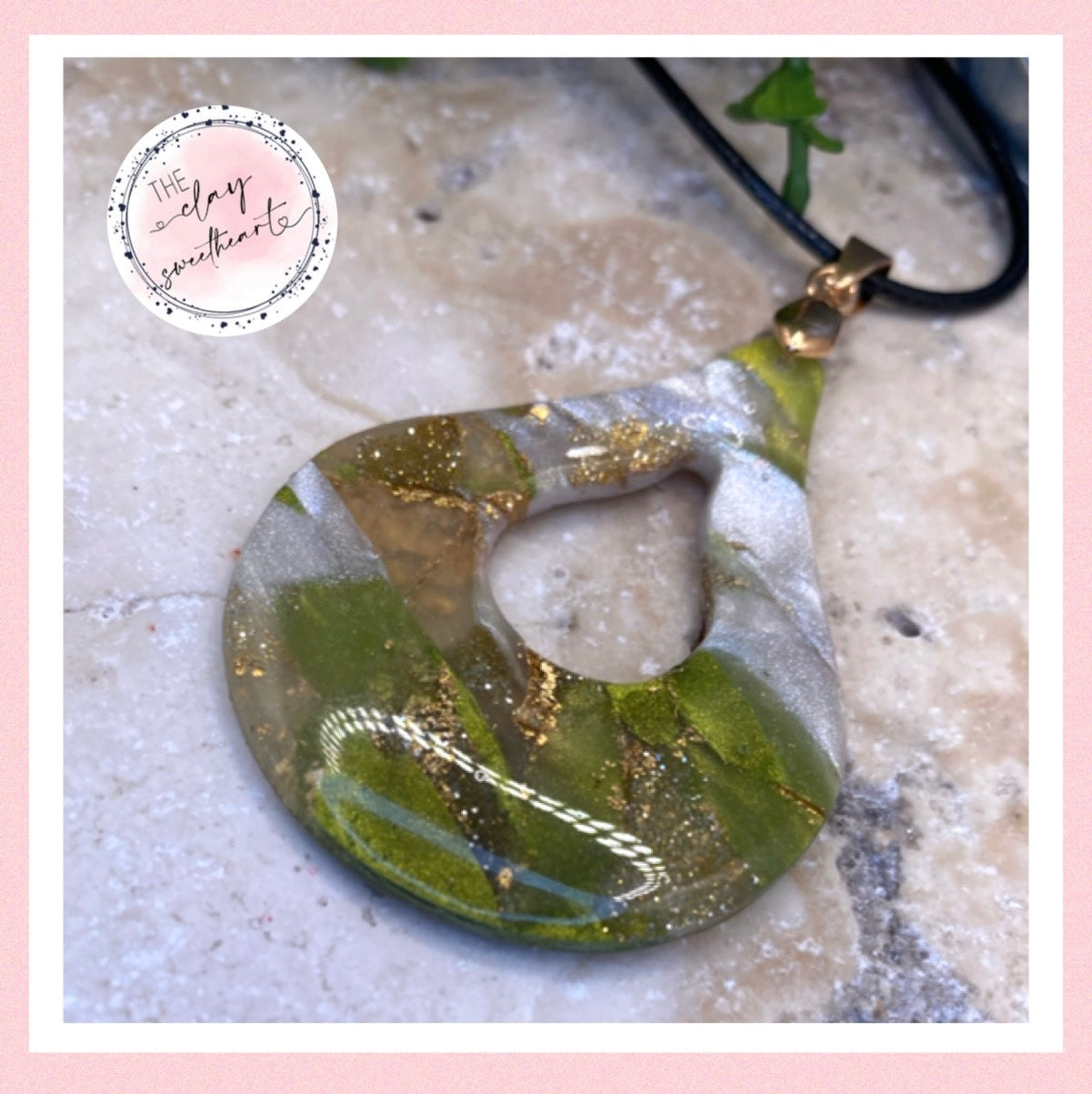 green and gold polymer clay teardrop necklace with 16” black cord with a 2” extender.