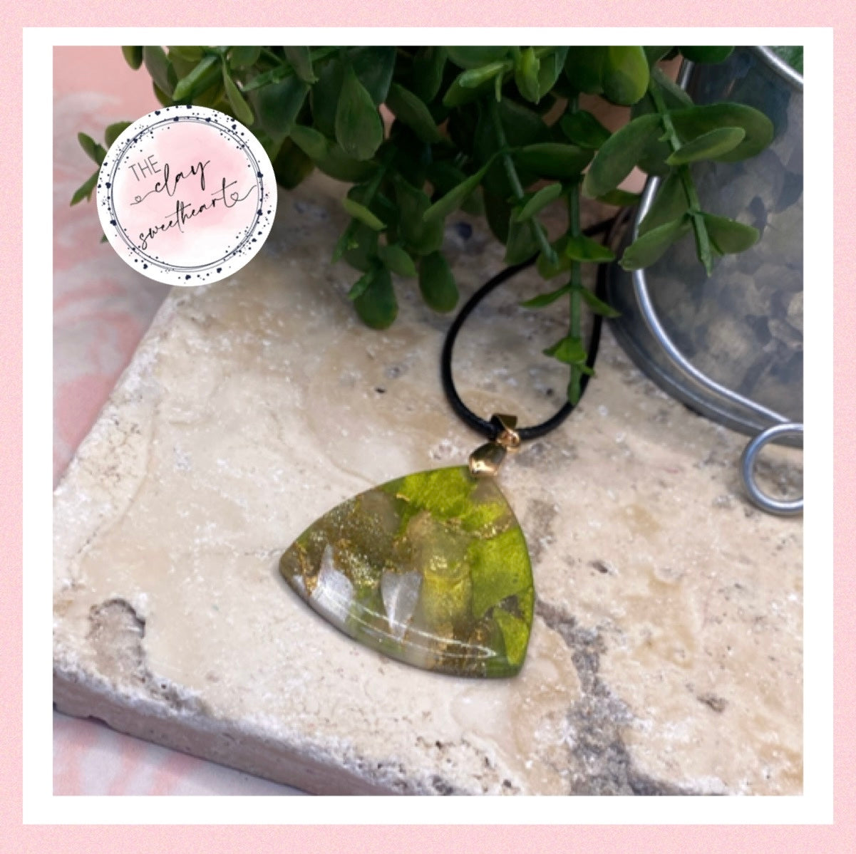 green and gold polymer clay triangle necklace with 16” black cord with a 2” extender.