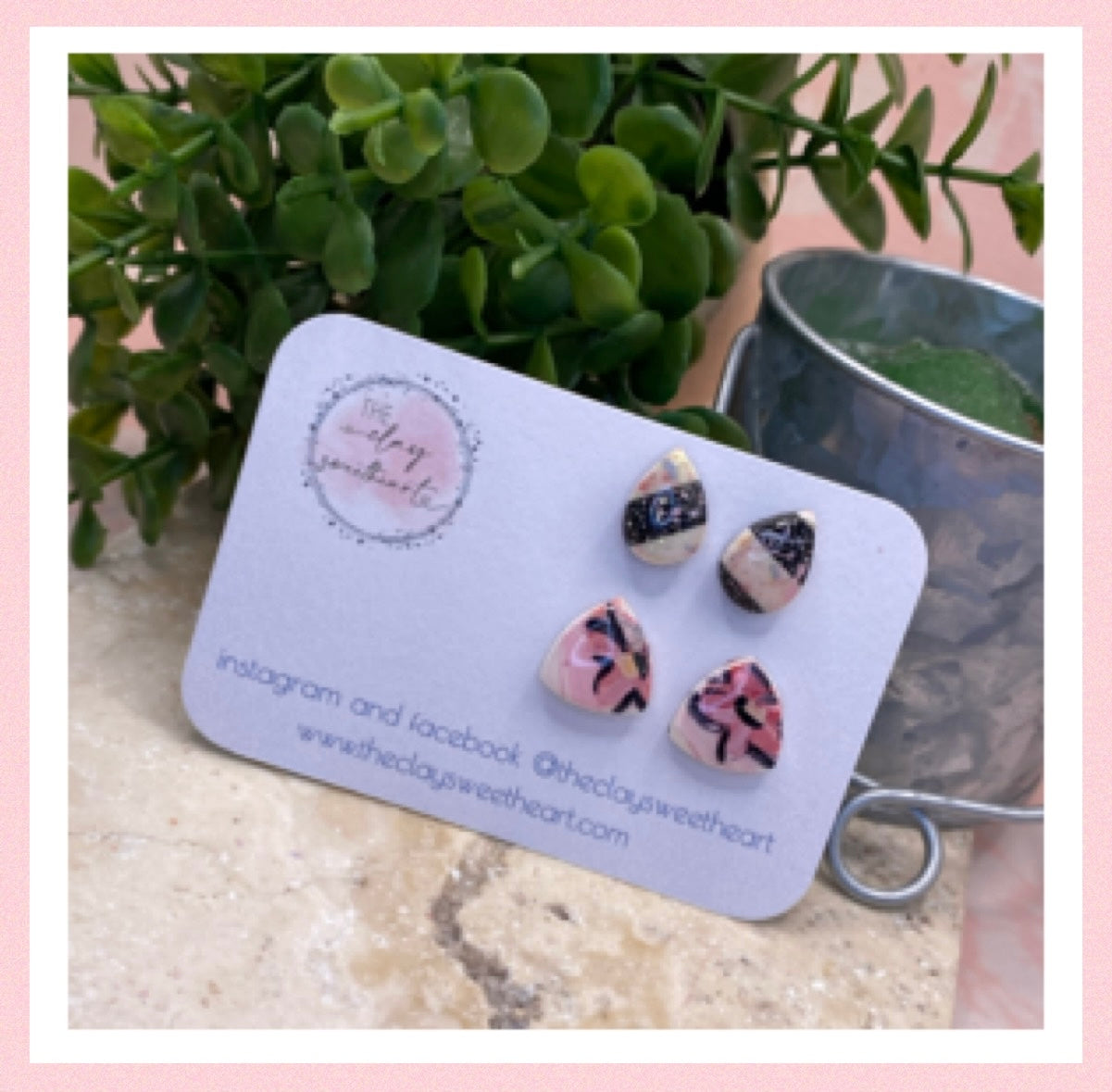 Hand painted polymer clay stud earrings. 1 pair with pink floral design and 1 pair with stripes. All have stainless steel posts