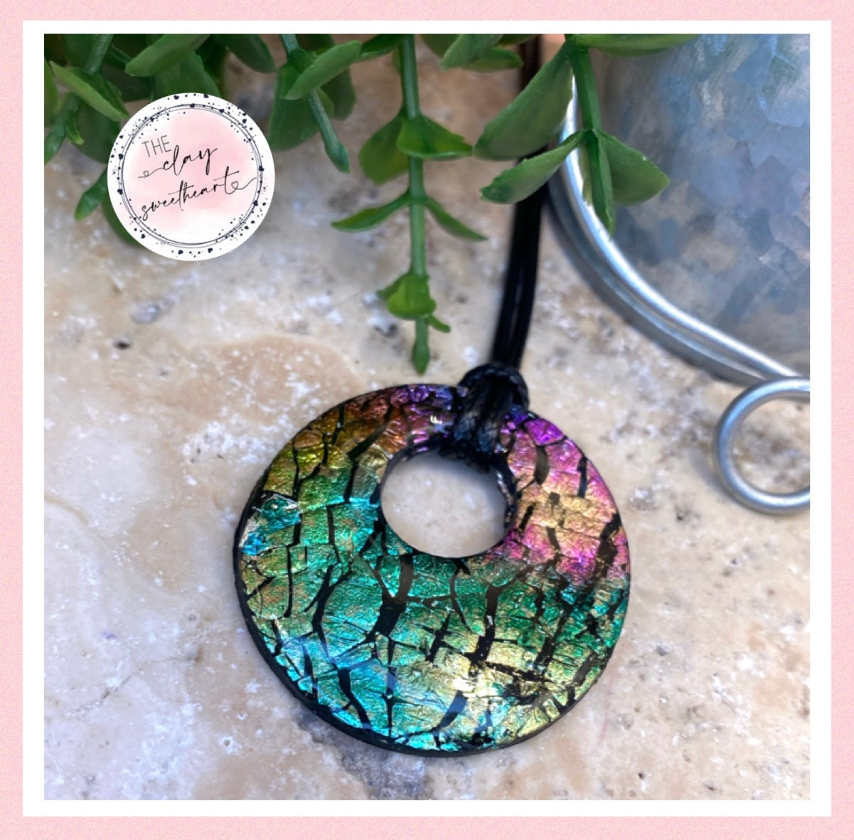 This beautiful circle (1.5” diameter) necklace comes on a 16 inch black cord with 2” extender.