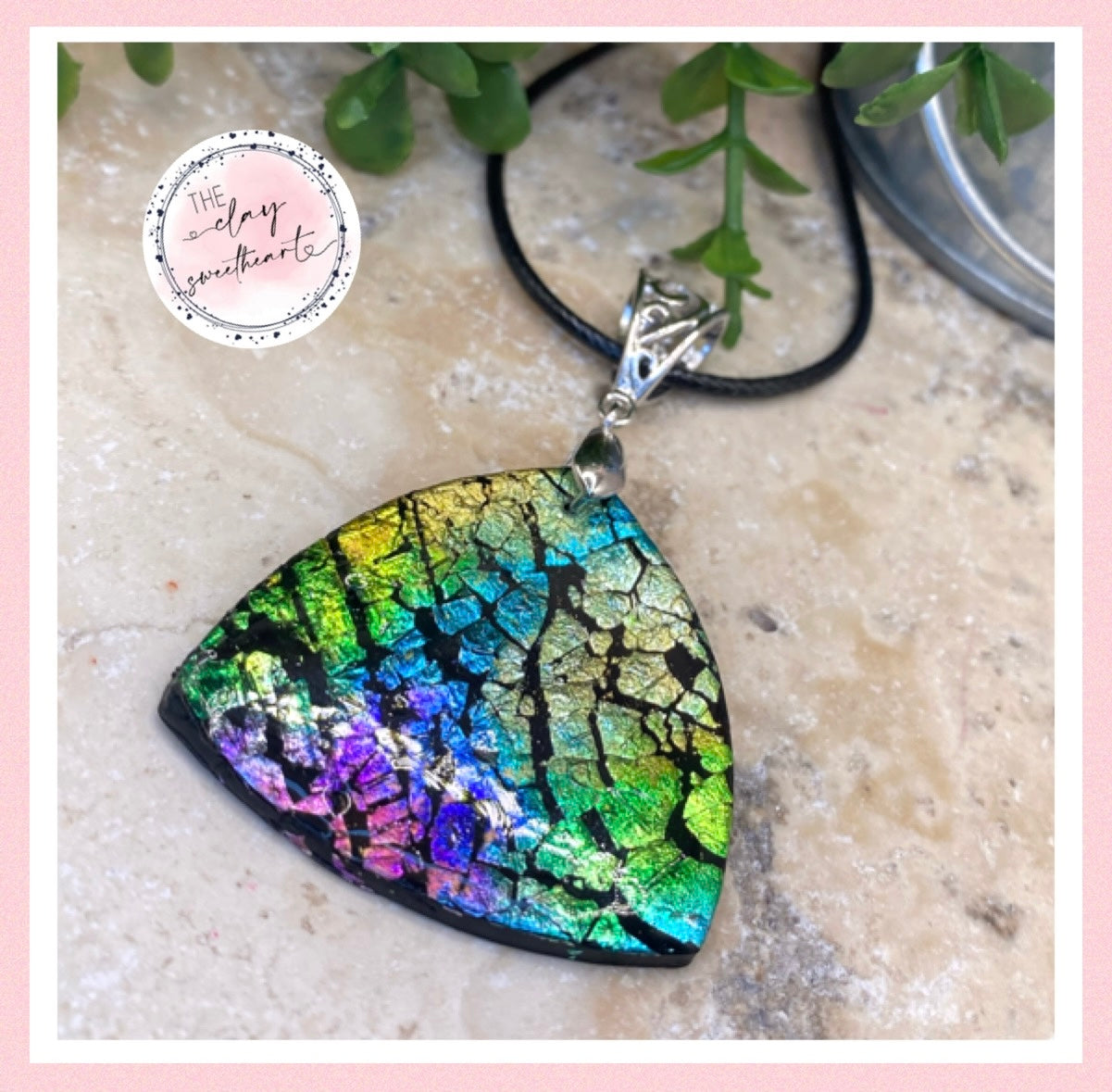 This beautiful polymer clay triangle necklace comes on a 16 inch black cord with 2” extender.