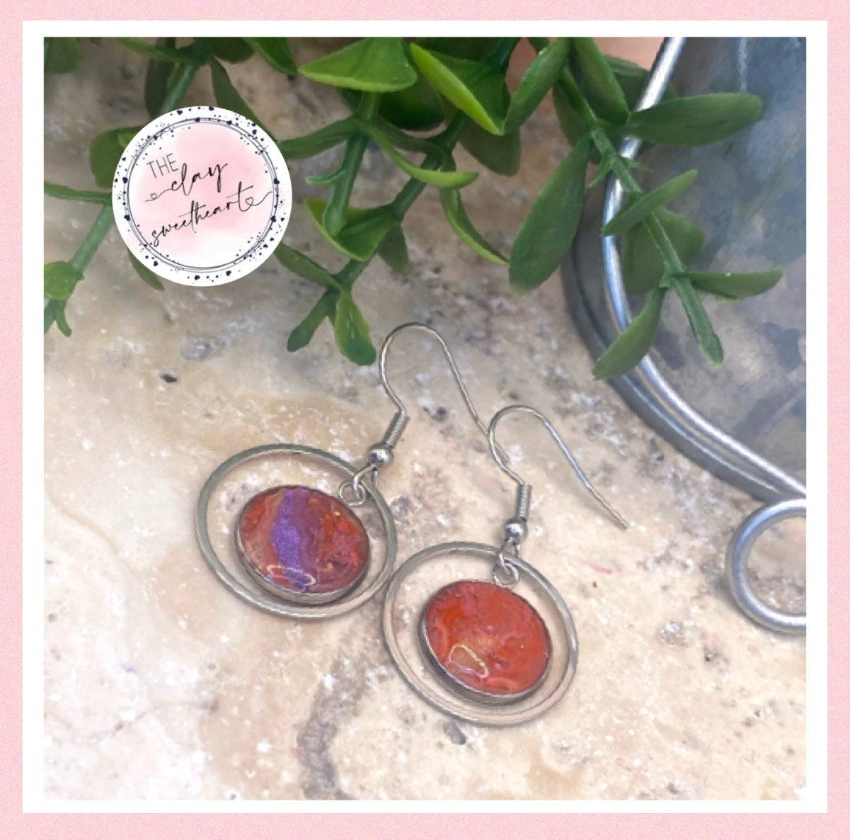 Polymer clay jewelry from the red collection. This pair of red earrings has stainless steel hooks. They measure 3 cm or 3/4” in length.