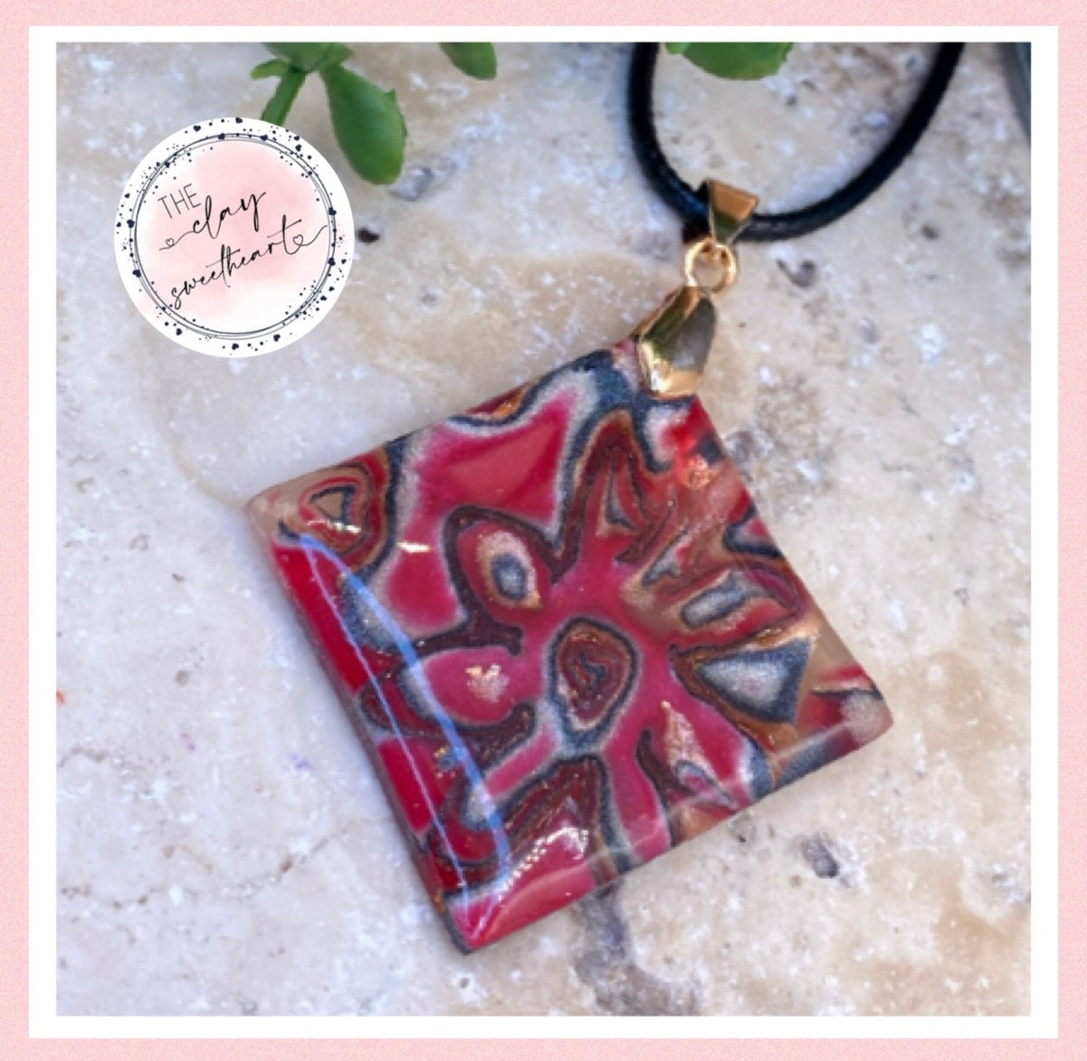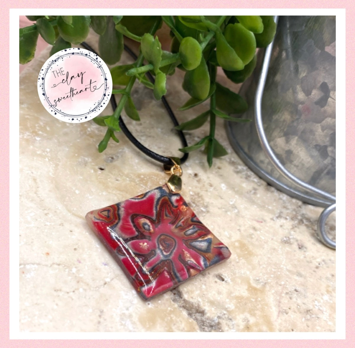 Polymer clay jewelry from the red collection. This red metallic floral square necklace is on a 16” black cord with a 2” extender.