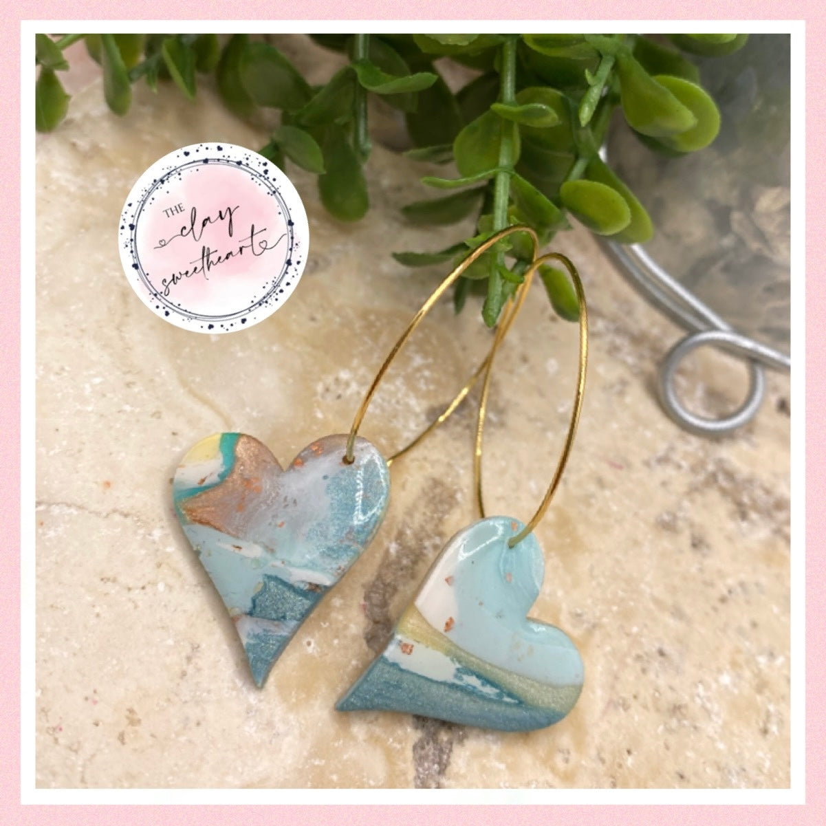 Blue beach vibe earrings on gold colored stainless steel hoops. These are reversible.