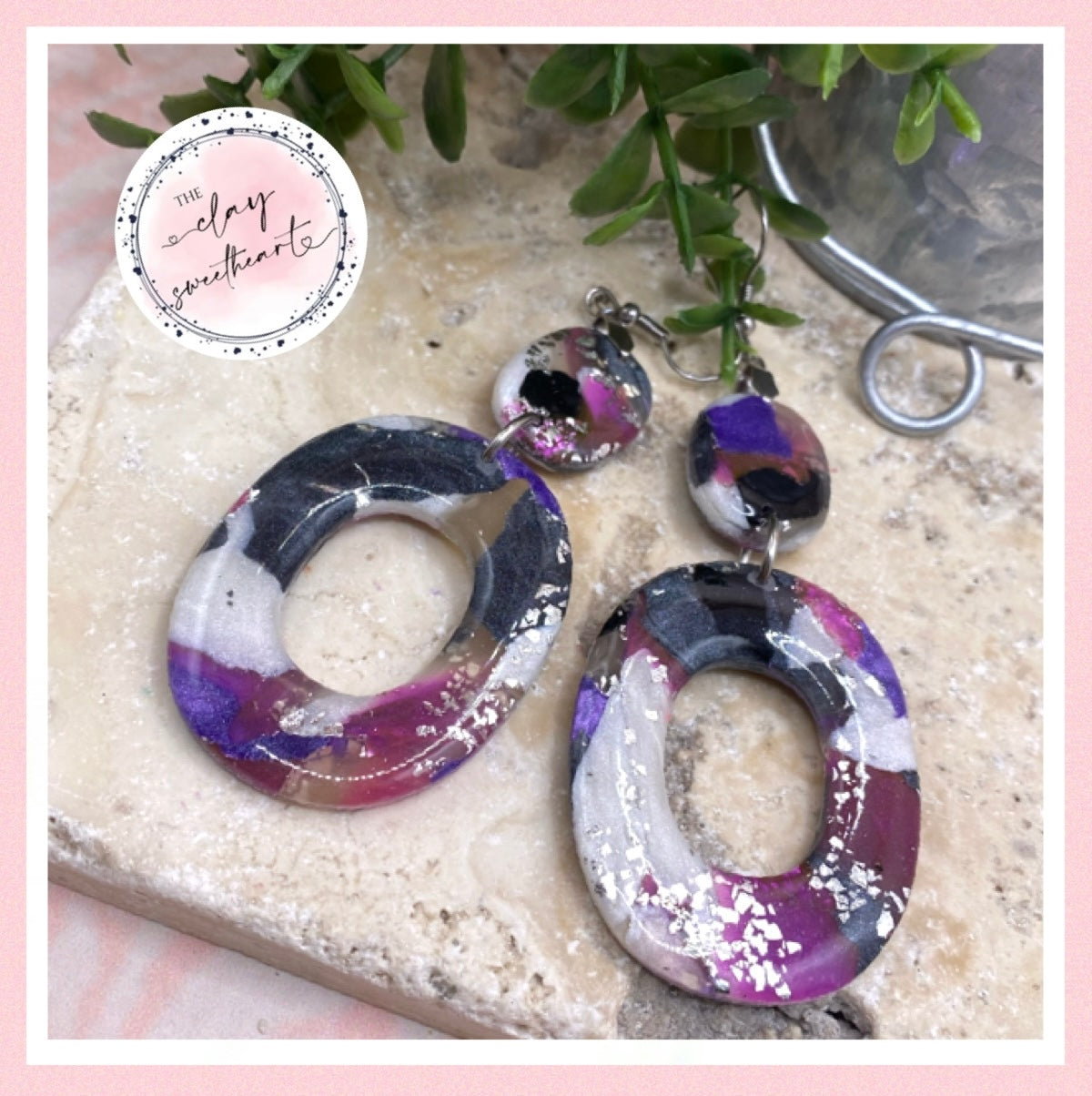 Large purple, black and silver earrings on silver colored stainless steel hooks.