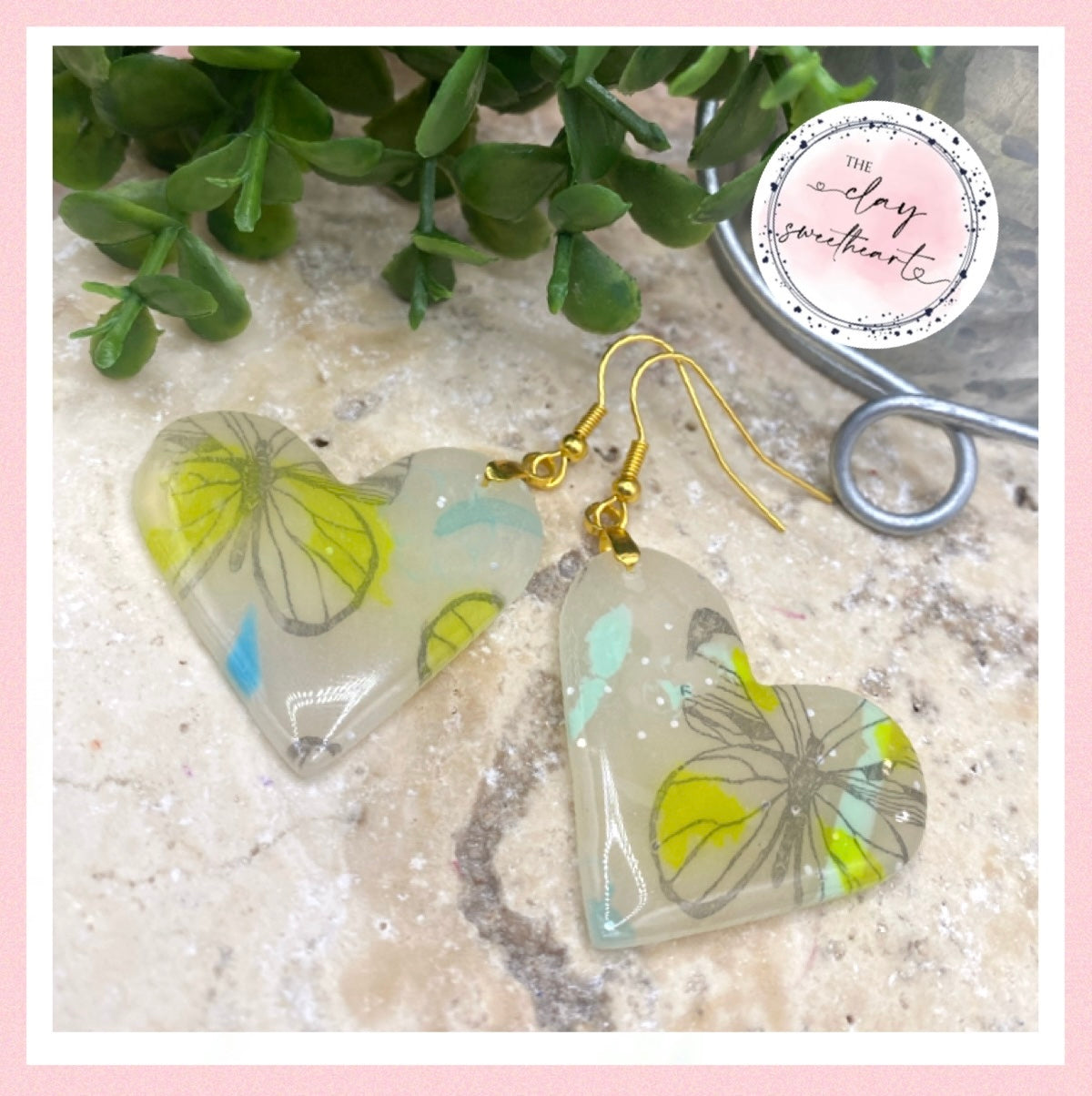Butterfly print heart earrings on gold toned stainless steel hooks.