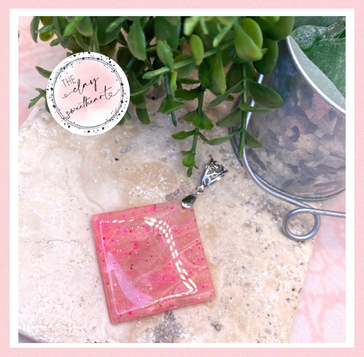Pink and silver square necklace. This necklace has a translucent quality(see video). The pendant comes on a 16” black cord.