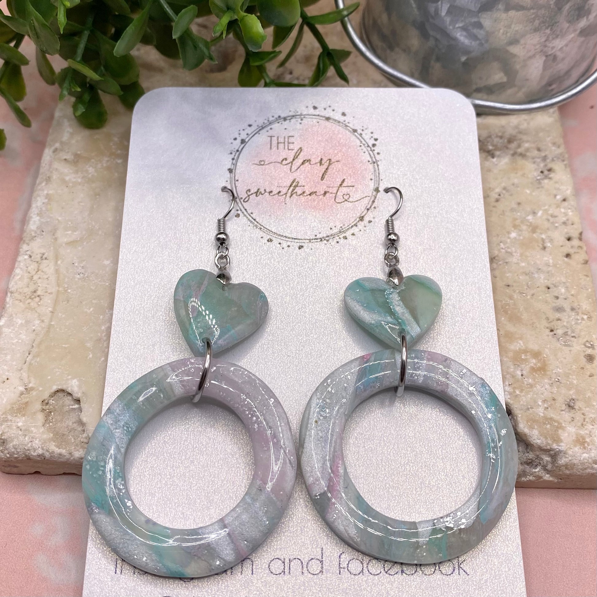 Polymer clay heart hoop earrings with stainless steel findings.