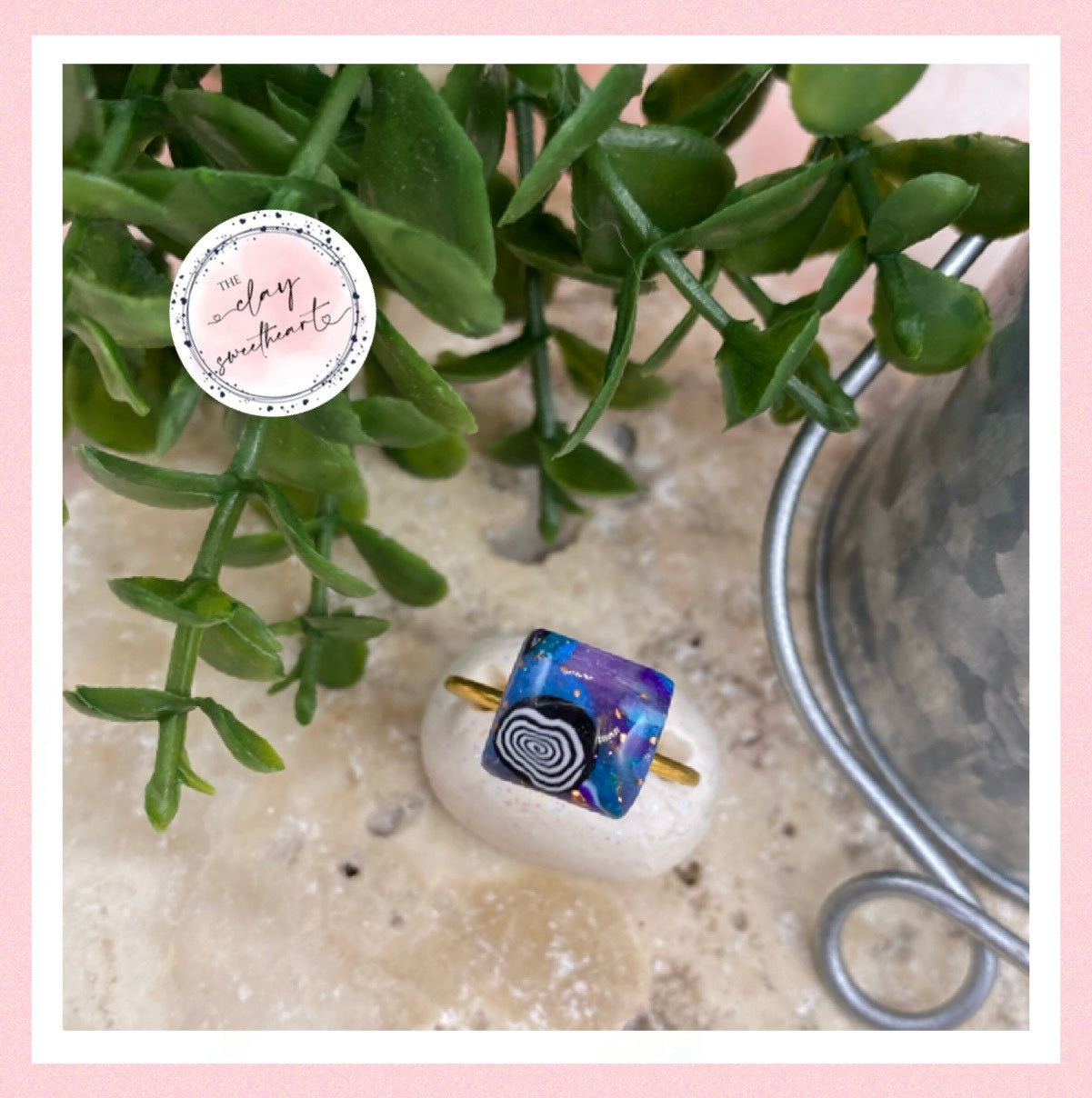 RINGS: All come on a silver or gold toned stainless steel base (as shown in photo). All are adjustable. Silver rings are open in front and gold are open on bottom.