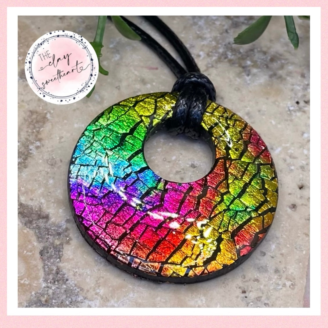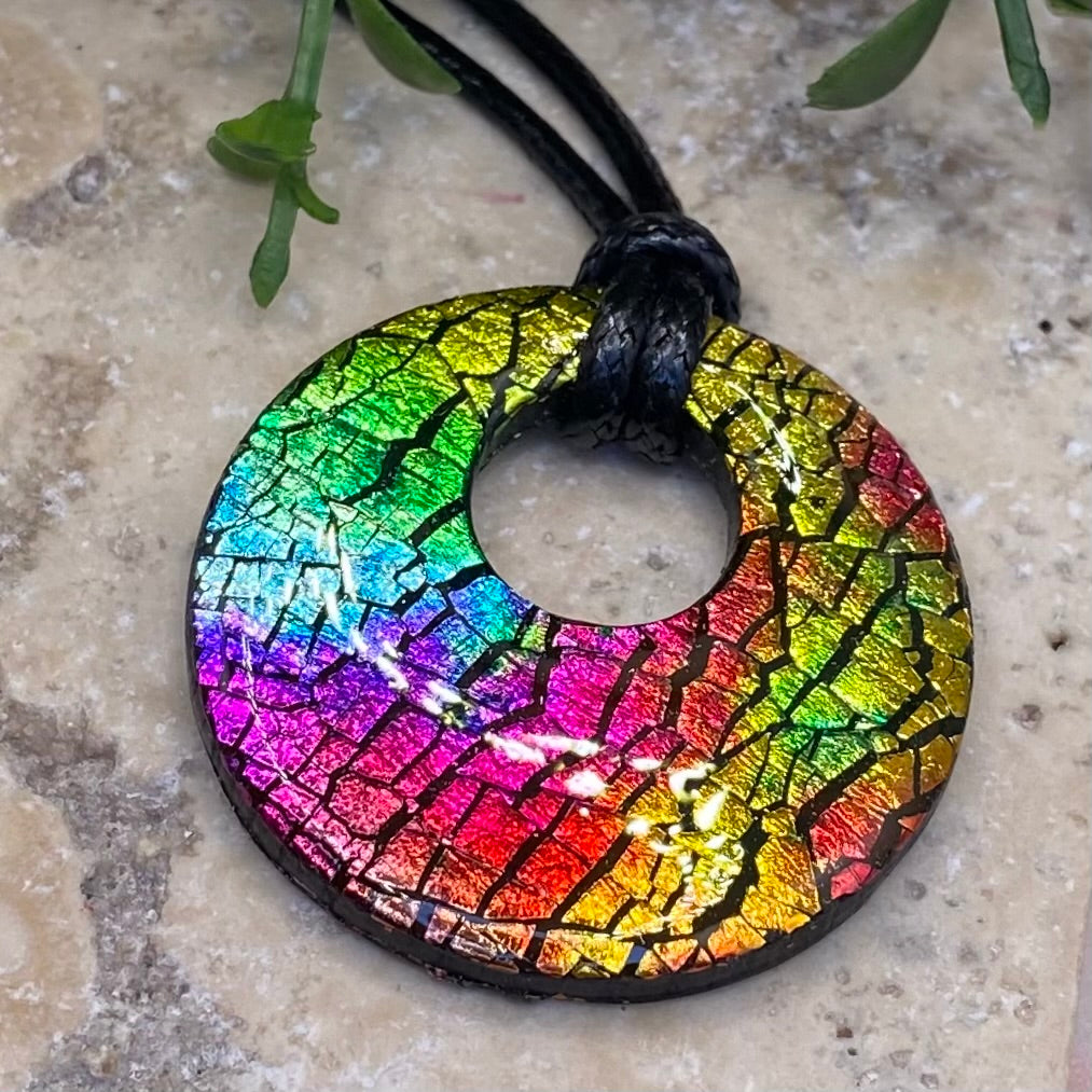 This beautiful circle (1.5” diameter) necklace comes on a 16 inch black cord with 2” extender.